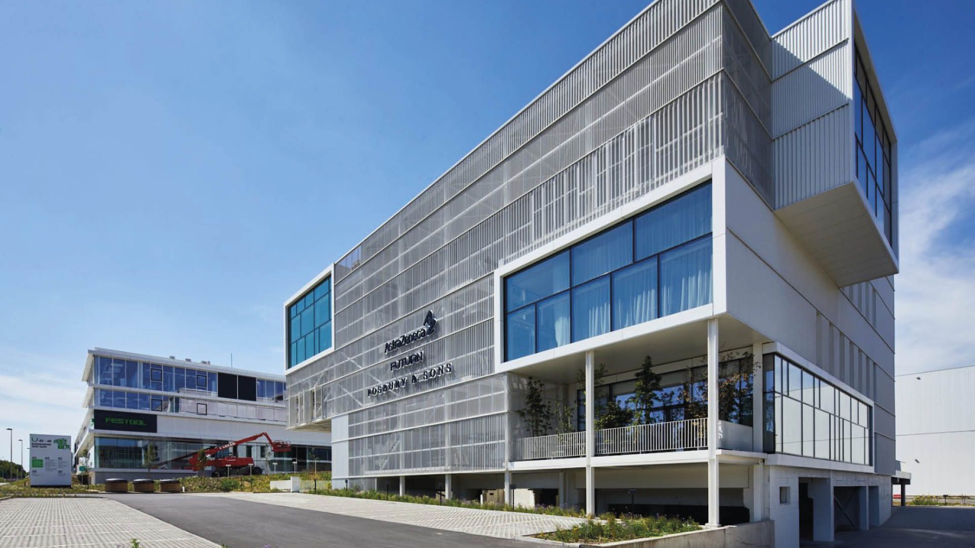 Le bâtiment a été complètement dépouillé de son enveloppe, puis recouvert d’une paroi légère bien isolée composé de plateaux de bardage et achevée avec un bardage blanc avec des profilés sinusoïdaux. Des caissons métalliques en porte-à-faux ont été accrochés à la façade à plusieurs endroits stratégiques. La pièce maîtresse, cependant, est la structure métallique ouverte sur la façade avant. La combinaison étonnante de bandes horizontales comportant trois types de tôles ondulées perforées crée un raffinement esthétique et un jeu d’ombres intéressant.