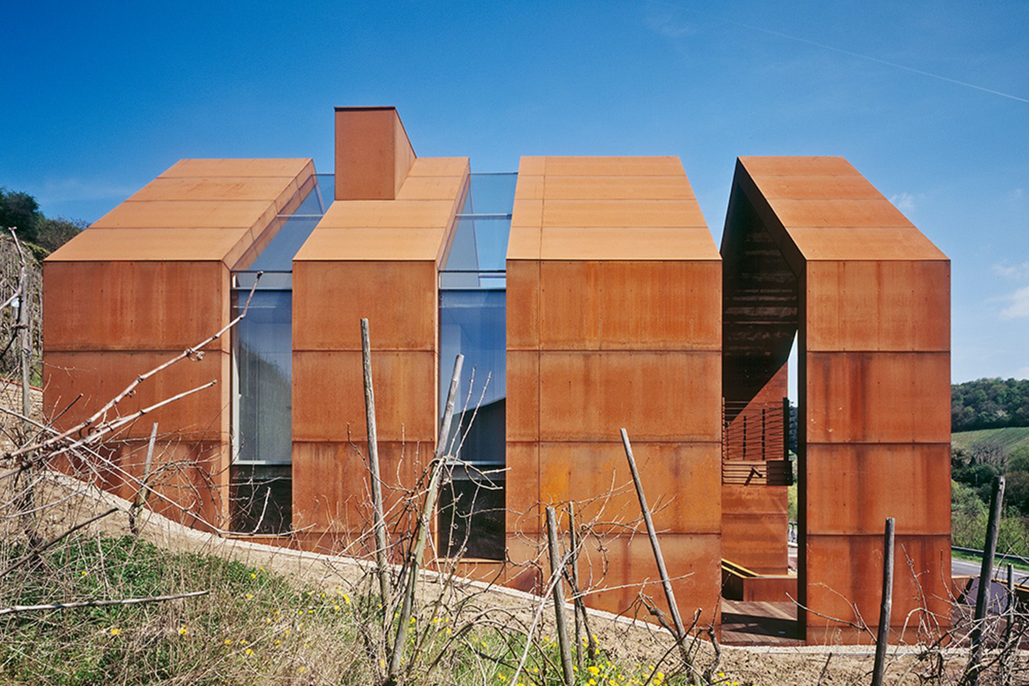 La maison, largement vitrée et transparente, acquiert sa robustesse et sa vigueur grâce à l’enveloppe d’acier auto-patinable de 2 mm d’épaisseur qui la protège comme la carapace de certains animaux. Elle est ainsi posée fermement dans la partie montante du vignoble, à l’une des extrémités d'un village des plus connus de la région viticole de la Moselle, haut-lieu du Riesling luxembourgeois.