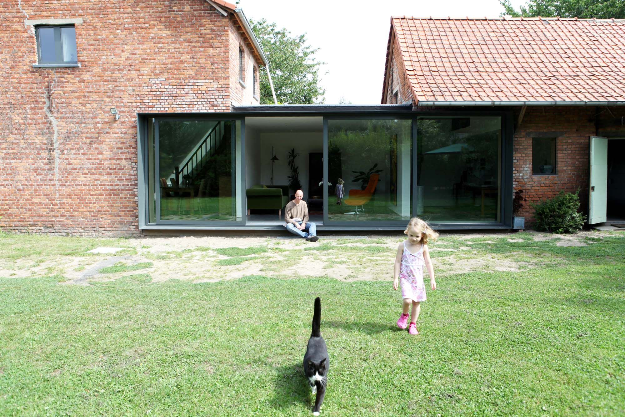 Le patrimoine et le budget sont les deux éléments qui ont orienté le choix vers la rénovation. D’une part, la typologie témoigne dans son ensemble d’un mode de vie appartenant à des temps révolus et la vieille brique de Boom est menacée de disparition. D’autre part, la rénovation s’imposait au maître d’œuvre du fait que le prix payé pour l’achat du bien ne laissait qu’un budget limité pour la construction. D’un point de vue architectural, l’accent a été mis sur la réalisation d’une nouvelle liaison entre la maison et la remise, et entre l’habitation et le jardin. Pour y parvenir, le choix s’est porté sur le métal, solution qui permettait de ne pas devoir faire un tour de force architectural tout en réalisant des économies en matériaux et en énergie.