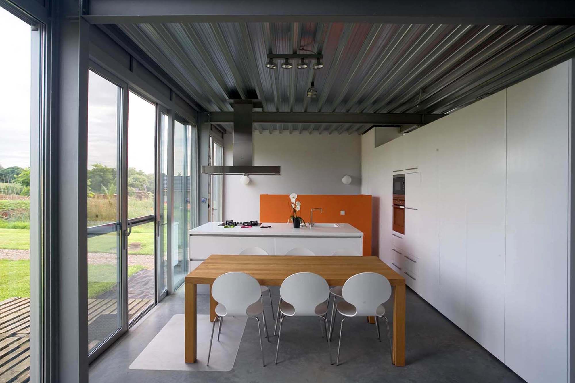 Le maître de l’ouvrage de cette habitation isolée souhaitait créer une habitation-loft. Pour réaliser ce projet, l’architecte a utilisé un squelette en acier composé de poutres et de colonnes en acier, de panneaux steeldeck et de panneaux sandwich, tous laissés apparents. Pour les planchers, le choix s’est porté au rez-de-chaussée sur le polybéton et pour l’étage sur des panneaux OSB vernis, afin de renforcer davantage ce caractère de loft. Le plan montre un volume en forme de poutre abritant l’espace d’habitation et la chambre à coucher des parents. L’utilisation de l’acier et des caractéristiques qu’il présente a d’emblée offert des possibilités architecturales supplémentaires et audacieuses. En considérant la force de traction comme principe créatif, il a été parfaitement possible, grâce à l’ossature en acier, d’adjoindre au volume principal un volume extérieur dans lequel les chambres d’enfant ont été installées. La partie en surplomb sert en même temps de parking couvert