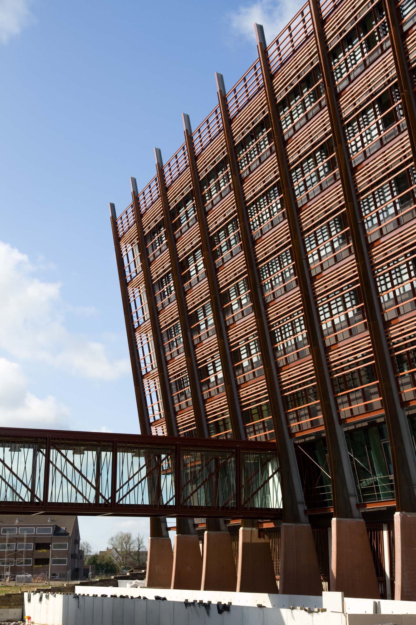 Le bien-être et le bonheur des usagers quotidiens sont au centre de ce projet. Les deux volumes de bureaux seront entourés d’eau et de verdure. Cette valeur esthétique et émotionnelle se prolongera aussi dans les espaces intérieurs avec de hauts plafonds, beaucoup de lumière et des espaces ouverts. La construction possède en outre un précieux aspect écologique, aussi bien en termes de choix des matériaux que des techniques utilisées. L’association d’un triple vitrage, d’une contre-structure de 240 tonnes d’acier, d’une isolation très épaisse des murs et des toits et de l’activation du noyau de béton permet de diviser par quatre la consommation énergétique par rapport à un bâtiment traditionnel. La contre-structure, d’un montage rapide, est construite indépendamment, sans perforation de la façade, évitant ainsi les ponts thermiques.