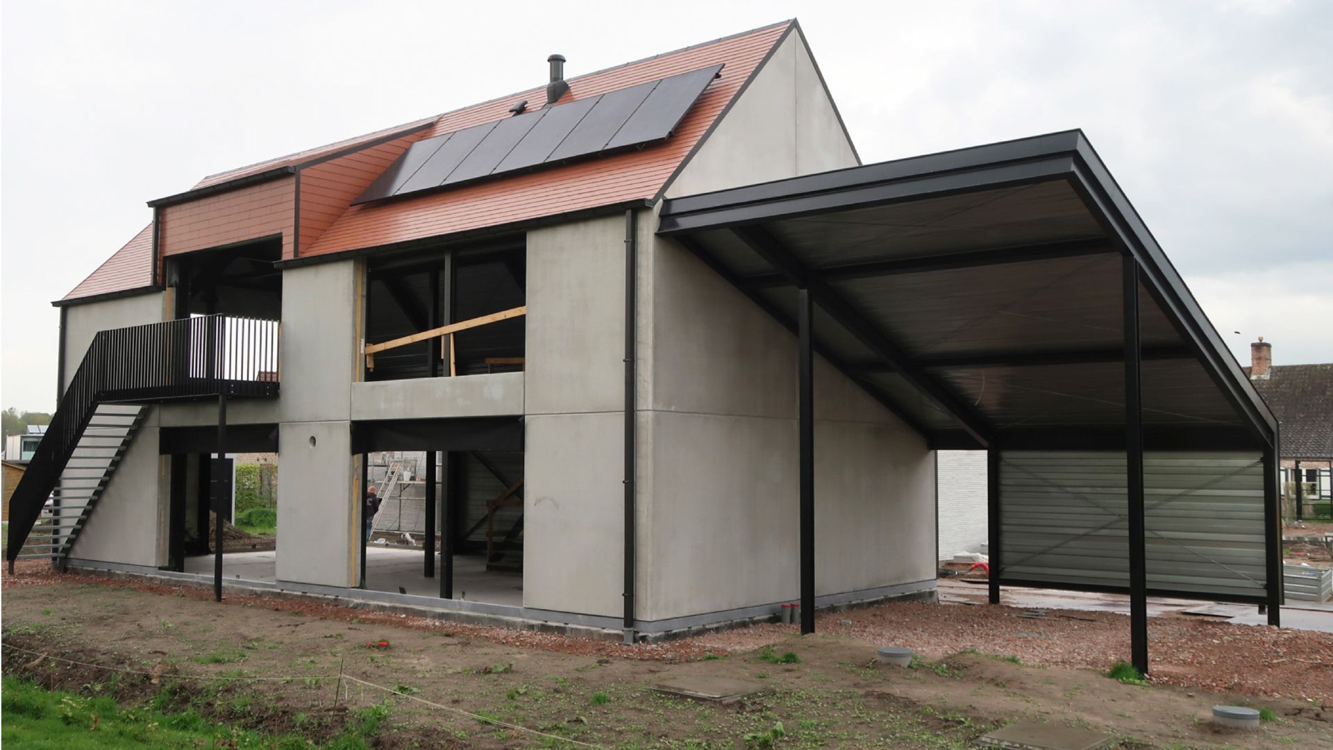 La structure extérieure en acier avec des caillebotis galvanisés relie l'espace de vie du premier étage à la terrasse et au jardin. Le toit en pente avec lucarne rampante est construit avec des caissons intérieurs galvanisés sur des fermes en acier, comme pour le carport, et garantit un plan ouvert sous la structure restante visible du toit.