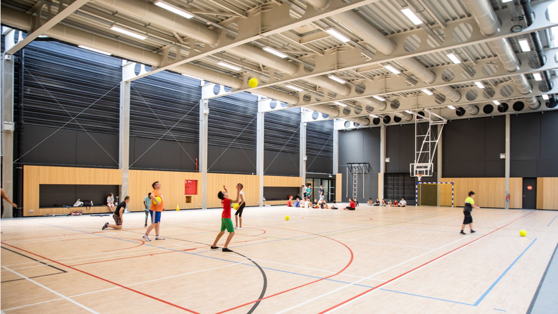 Niveau structurel, le béton et l’acier sont les deux matériaux utilisés ; l’acier étant la composante principale de l’aire de jeu. La salle de sport est construite avec des poutres ACB (poutrelles alvéolaires à ouvertures circulaires, longueur 22 m) permettent la traversée des techniques spéciales et, par conséquent, une diminution de la hauteur du bâtiment. Ce qui donne un gain économique au niveau de développent de la façade. Les supports d’étanchéités métalliques et bacs acier de façade perforés permettent d’atteindre des valeurs d’affaiblissements acoustiques optimales – l’ouïe étant l’élément essentiel pour les personnes malvoyantes.
