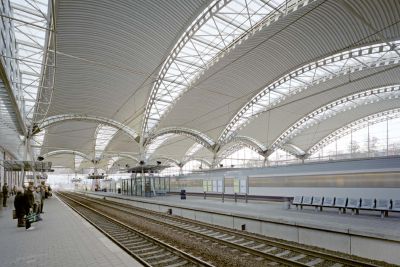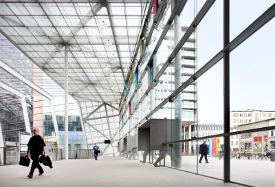 Tekst: <p>La nécessité d’ajouter une deuxième entrée à la gare d’Anvers-Centrale est apparue lors de la réalisation du tunnel sous la gare. Ce nouveau bâtiment est constitué en surface d’une structure en acier jaillissant littéralement du sous-sol. La structure est revêtue de verre et de grillages en acier, de manière à laisser la lumière du jour y pénétrer en abondance. La structure en acier suit une grille d’axes perpendiculaires aux voies de chemin de fer ; à son périmètre, la structure est parallèle aux constructions citadines environnantes. Par ailleurs, le toit et la façade latérale ont été conçus comme un plan plié autour d’un axe également parallèle au bâti environnant. La confluence des deux systèmes d’axes apporte à la structure en acier une dynamique résolue. Il n’était pas imaginable d’utiliser d’autres matériaux pour cette intervention contemporaine, alors que le hall de la gare, érigé il y a 110 ans, est lui-même complètement fait d’acier.
