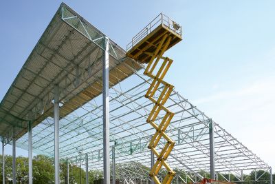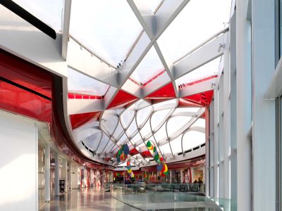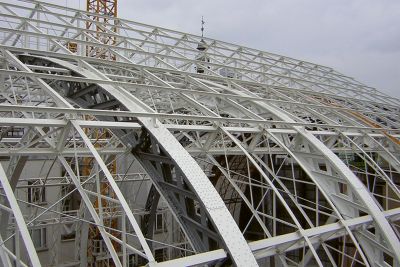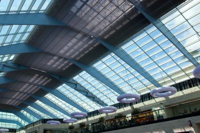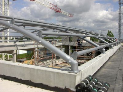 La charpente métallique a permis, par des moyens simples, de réaliser la forme en aile d’avion de la toiture, tout en créant un espace technique. La structure de la toiture est un grillage de poutres en treillis de 100,8 x 108 m. Des chevêtres au nombre de 49 sont réalisés pour servir d’appui aux coupoles d’éclairage. Les façades se caractérisent par une structure d’échelles en acier très mince, habillées par un vitrage ultra performant. Les montants et les traverses sont réalisés par découpage de plats d’acier, assemblés en profilés T par soudage invisible. Les échelles, sont reliées par des traverses et des éléments de jonction spéciaux, boulonnés. Ces assemblages sont partiellement mobiles et fixes afin de reprendre les tolérances constructives, la dilatation et les déformations dues au vent.</p>
