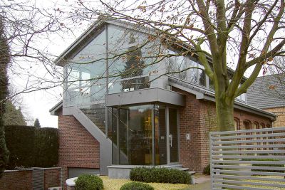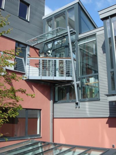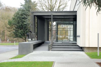 Les escaliers en béton ont été remplacés par une pente d’accès. La réception a été agrandie et entièrement vitrée, et également équipée d’un sas et d’une protection solaire fixe afin d’éviter toute surchauffe en été. Tous les éléments porteurs, ainsi que la surface de la pente d’accès, sont en acier. <br>