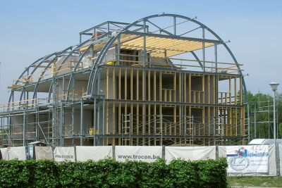 Tekst: <p>Pour l’extension de cette habitation datant de 1960, le choix s’est porté sur une superstructure totalement indépendante, s’appuyant sur quatre parois massives. Il était en effet impossible de construire un étage sur la structure existante : le rez-de-chaussée se présentait en porte-à-faux d’environ 70 cm par rapport à la cave et le toit plat était constitué d’un gîtage en bois. La cage d’escalier est la seule liaison entre les deux volumes de construction. Une structure en acier s’est révélée la solution idéale pour réaliser la portée de 17 m. Tant les quatre façades extérieures que la structure incurvée du toit ont été complètement montées en acier. L’ensemble des parois et de la toiture a été construit sur une structure secondaire isolée en bois. Le parachèvement extérieur est en zinc.</p>