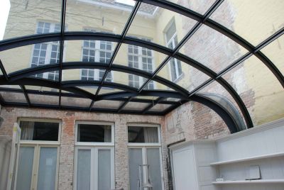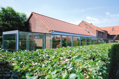 Tekst: <p>Le maître d’ouvrage de cette maison de maître brugeoise typique souhaitait agrandir son habitation avec une orangerie répondant au confort de vie actuel tout en respectant le style rétro existant. Pour cette construction vitrée en acier, l’architecte a opté pour une structure d’ailettes en acier avec assemblages à rainures et languettes. Tous les éléments ont été découpés séparément dans des tôles d’acier de 12 ou 15 mm d’épaisseur au moyen d’un laser 3D. L’acier est de qualité St 37. Ces ailettes découpées au laser constituent la base de la construction et servent aussi de gabarit pour le pliage des profils de façade en acier supportant le verre. Le système de façade en acier - Jansen Viss TVS - est constitué d’un sous-profil en acier avec caoutchoucs et nœuds d’assemblages isolés, ce qui garantit un ensemble étanche au vent et à l’eau sans ponts thermiques.