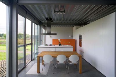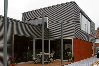 Tekst: <p>Les maîtres d’œuvre, passionnés de moteurs et fervents observateurs d’étoiles, avaient en matière d’habitat des souhaits simples, mais non dénués d’une certaine obstination. Ils désiraient une habitation à la fois petite et spacieuse avec des allures de loft. Une habitation compacte d’une surface ne dépassant pas les 100 m2, mais correspondant pleinement à leurs passions fut construite sur un squelette en acier. De leur bain à bulles, on peut contempler le ciel étoilé et de n’importe quel endroit de l’habitation, voir briller les bolides. Le jardin peut être observé à partir du lit et une terrasse couverte est intégrée dans le prolongement de la salle de séjour. La construction à ossature en acier utilise des poutres et des colonnes en acier, des planchers intermédiaires et une toiture en steeldeck, des panneaux sandwich Kingspan et du zinc. Le revêtement extérieur en zinc bleu, une primeur, irradie véritablement l’habitation. </p>