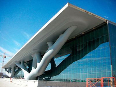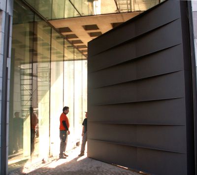 Des écrans métalliques font alterner des intervalles fermés et ouverts dans la galerie. L’entrée des halls d’exposition est mise en évidence par un bâtiment de bureaux et d’accueil où la trame carrée d’ossature devient tridimensionnelle, créant ainsi un portique vers l’intérieur. La matérialité de la galerie continue au travers du bâtiment d’accueil, marquant ainsi l’entrée vers la Rambla, l’axe principal du site. La grille en acier qui surplombe l’espace d’accueil est complétée par un volume noir abritant trois étages de bureaux. L’ossature apparente est constitué de profilés HEA 300 laqués en blanc mise en valeur par un couverture en profilés galvanisés.