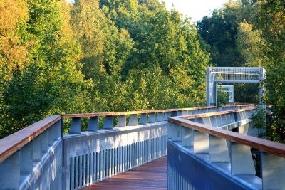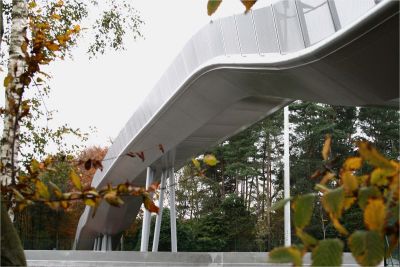 Tekst: <p>Le domaine ‘‘t Greven’ à Eisden est l’épicentre d’un spectaculaire affaissement minier. Le sol se situe plus de 10 m sous son niveau d’origine. Depuis la berge du Zuid-Willemsvaart - 11,50 m de hauteur à cet endroit - part un sentier de balade en acier qui traverse la couronne des arbres. L’acier a été choisi pour la structure. Elle est constituée d’éléments de passerelle, chacun composé de deux parties boulonnées entre elles. Les éléments de passerelle sont alternativement posés sur une tour et un pilier. Les piliers reprennent les efforts verticaux, les tours reprennent les efforts verticaux et horizontaux. Les garde-corps sont construits comme une poutre assemblée, dont l’âme est percée de manière à permettre aux petits enfants d’observer les environs. Les tours sont revêtues d’un treillis métallique permettant aux plantes grimpantes de s’y accrocher et aux tours de se fondre dans la nature.</p>