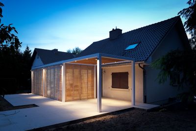 Tekst: <p>La nouvelle terrasse est construite en porte-à-faux, au-dessus de l’entrée de garage. La structure est constituée d’une plateforme en poutres laminées reposant d’un côté sur 2 piliers en acier et fixée de l’autre côté sous la dalle du rez-de-chaussée. Entièrement réalisée en acier galvanisé en raison de sa légèreté et de ses qualités structurelles et anticorrosives, la terrasse est bordée d’un garde-corps en matériel composé ornementé reprenant l’aspect métallique de l’ensemble.</p>