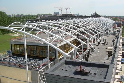 Tekst: <p>La nouvelle piscine de Maaseik est adjacente au complexe sportif existant. Elle comporte une pataugeoire, une piscine récréative, un bassin de compétition et un bassin avec deux toboggans aquatiques, ainsi qu’une cafétéria avec terrasse extérieure. La structure du toit en acier accroche le regard. Elle est constituée de profilés tubulaires courbes en acier. Le choix de l’acier a permis de réaliser ces fermes courbes avec un minimum de colonnes. Les profilés tubulaires en acier ont été dotés sur leur partie supérieure d’un profilé en T soudé afin de fixer le steeldeck. Les profilés tubulaires reposent sur des colonnes en béton auxquelles elles sont fixées par un assemblage de tenons et mortaises. Pour la travée la plus importante (35 m), les profilés tubulaires ont été scindés en deux parties et assemblés par un système tenon et mortaise articulé.