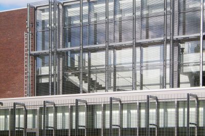 La nouvelle extension, un volume entièrement vitré, s’enveloppe dans une peau réalisée en caillebotis d’acier galvanisé. Cette peau permet de garantir une certaine intimité pour les bureaux tout en offrant un maximum de lumière et en évitant l’éblouissement et les surchauffes. La disposition des panneaux de caillebotis s’inscrit en rupture des alignements rigoureux du bâtiment protégé, créant ainsi des jeux d’ombre et de lumière sur les façades.