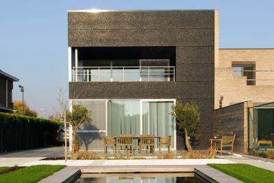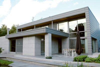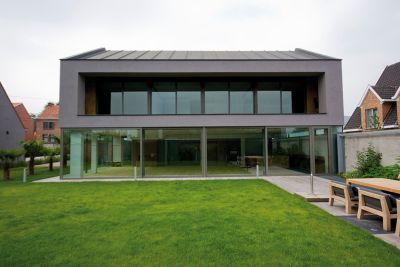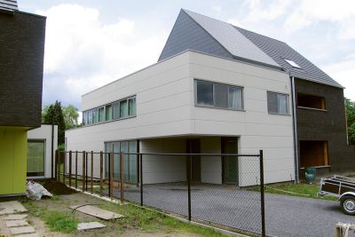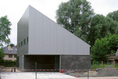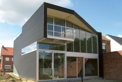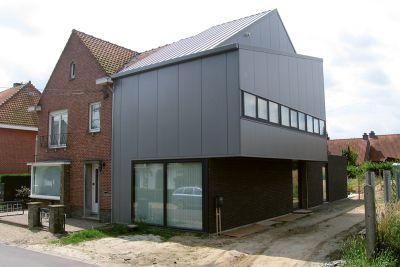Tekst: <p>Le volume construit de cette nouvelle habitation, incluant un bureau d’architectes se distingue par sa puissance et la pureté de ses lignes. Ces caractères, il les doit à son ossature en acier et au revêtement du toit et des façades. Ce revêtement est principalement constitué de tuiles, mises en valeur par des panneaux. Un volume est ainsi créé dont émane une impression de simplicité monolithique. La technique de construction associe une ossature en acier et un remplissage en bois du squelette. <br>