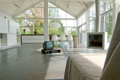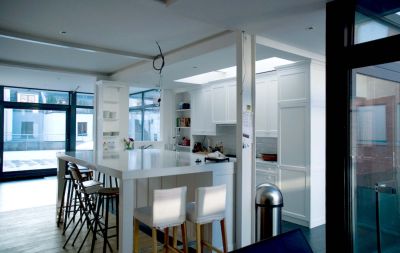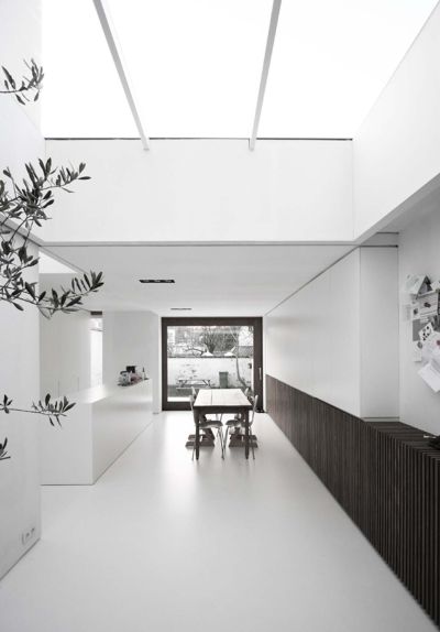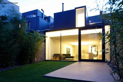 Tekst: <p>Le projet concerne la transformation profonde d’une maison de maître du 19e siècle. Alors que la façade imposante de la maison garde son cachet authentique plutôt secret, la partie arrière contraste par ses espaces d’habitation particulièrement aérés et clairs. Le grand espace libre, le patio, les larges verrières, la lumière zénithale et les perspectives variées créent un espace à l’ambiance captivante. La fenêtre sur la largeur totale de la pièce, projette véritablement le jardin à l’intérieur de la maison. Le choix s’est porté sur une structure principale en acier dans le but de disposer d’un plan ouvert. Des colonnes, cachées dans une contre-cloison et dans une armoire multifonctionnelle, ont ainsi été érigées le long des deux murs communs. Les poutres en acier ont été intégrées dans l’épaisseur des hourdis afin d’éviter leur affaissement. Comme pour l’essentiel l’acier a été rendu invisible, il ne constitue pas un élément visuel frappant ; seul le puzzle raffiné d’éléments en acier pimente cette sobre architecture. Rien de spectaculaire donc, mais de l’efficacité.</p>
