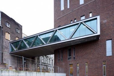 Tekst: <p>Outre la rénovation de plusieurs bâtiments, le campus Sint-Lukas de Bruxelles prévoit également une construction neuve. Élément important de cette construction, le ‘pont’ reliant la nouvelle tour en briques et les blocs néogothiques encore à rénover se trouvant en cœur d’îlot. Cette liaison est construite autour de deux fermes en acier entre lesquelles est montée une structure de sol et de toiture. À l’arrière, se trouve une petite ferme de 15 m de long; à l’avant, on trouve une ferme de 29 m de long. La hauteur est de 4 m. La toiture légère est constituée de tôles d’acier profilées galvanisées portantes. Les fermes en acier forment littéralement une colonnade contemporaine en hauteur. Les propriétés du matériau permettent de travailler avec des sections réduites pour les barres en traction et en compression.</p>