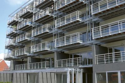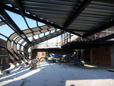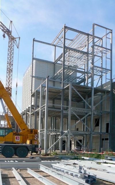 Pour faire face à ce problème, il a été décidé de construire au-dessus du parking existant, un nouveau bâtiment d’une capacité de 850 places. Le bâtiment est réalisé à partir d‘une ossature en acier galvanisé à chaud et d’un plancher collaborant. Le choix de ces matériaux a permis d’ériger une structure légère et mince en réduisant la durée du montage. <br>