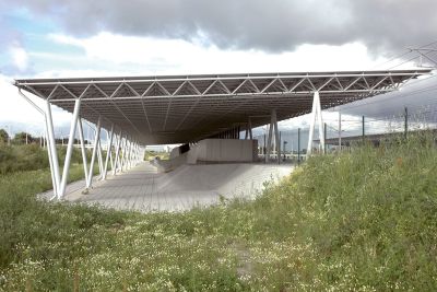 Tekst: <p>Le projet s’attache à concilier la conduite avec le goût du voyage, le monde autoroutier avec l’environnement, la sécurité avec le confort, l’utile à l’agréable. La compacité du projet a pour but de maximaliser les surfaces vertes, de minimiser les surfaces asphaltées et d’optimiser la fonctionnalité de la station. La composition et l’organisation fonctionnelle de la station se structurent en spirale autour du centre de la station qui est matérialisé par le patio d’entrée du bâtiment. Il est un point de ralliement et de rencontre pour toute l’aire. Autour de ce lieu central se déploient les toitures comme des ailes ou des dômes en toile de PVC blanche sur une structure en acier. Elles signalent la station depuis l’autoroute. Les différentes ailes couvrent un unique bâtiment pavillonnaire qui regroupe les services de la station. La démarche environnementale et le développement durable sont les fils conducteurs de tous les choix.