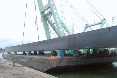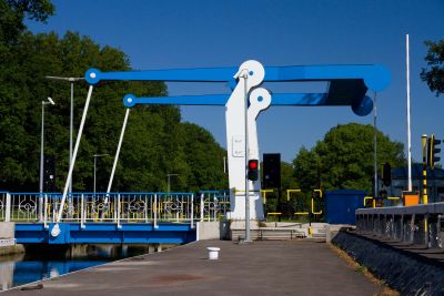 La solution d’un tablier mobile en acier semblait la seule option logique. L’acier a aussi été choisi pour la partie fixe du pont. Les tabliers des deux éléments du pont ont été réalisés au moyen de tôles orthotropes en acier S355 et recouverts d’époxy résistant à l’usure. Les poutres principales de la partie fixe sont des profilés en I, alors que celles de la partie mobile sont soudées en caissons. La partie mobile est équipée de deux triangles debout. L’angle supérieur de chaque triangle est relié à un câble. Le tablier du pont est levé et rabaissé lorsque ces câbles sont enroulés ou déroulés.</p>