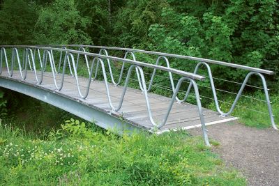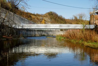 Tekst: <p>L’objectif de la conception de cette passerelle suspendue était de lui conférer une forme à la fois élancée, élégante et dynamique. La structure en treillis spatiale des poutres principales sert en même temps de garde-corps, permettant ainsi d’obtenir une structure en acier ultralégère. Associées aux câbles en acier anticorrosion de 5 mm de diamètre, les poutres treillis 3D offrent une transparence maximale vers l’eau. La structure du tablier en panneaux orthotropes se situe entre les poutres principales et, en raison de sa hauteur minimale, est invisible de l’extérieur de la passerelle. Une dynamique particulière est obtenue par l’obliquité des haubans et des pylônes, ainsi que par le contrepoids cylindrique en plomb. Le poids total de l’acier est de 30 tonnes.