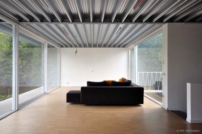 Tekst: <p>Le maître de l’ouvrage de cette habitation isolée souhaitait créer une habitation-loft. Pour réaliser ce projet, l’architecte a utilisé un squelette en acier composé de poutres et de colonnes en acier, de panneaux steeldeck et de panneaux sandwich, tous laissés apparents. Pour les planchers, le choix s’est porté au rez-de-chaussée sur le polybéton et pour l’étage sur des panneaux OSB vernis, afin de renforcer davantage ce caractère de loft. Le plan montre un volume en forme de poutre abritant l’espace d’habitation et la chambre à coucher des parents. L’utilisation de l’acier et des caractéristiques qu’il présente a d’emblée offert des possibilités architecturales supplémentaires et audacieuses. En considérant la force de traction comme principe créatif, il a été parfaitement possible, grâce à l’ossature en acier, d’adjoindre au volume principal un volume extérieur dans lequel les chambres d’enfant ont été installées. La partie en surplomb sert en même temps de parking couvert</p>
