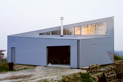 Un atelier avec toiture et façades métalliques complète l’ensemble construit. Partie remarquable, la façade de l’atelier est constituée de panneaux sandwich avec peau en tôle, dont celle située à l’extérieur présente une onde sinus posée dans le sens horizontal. La teinte retenue est RAL 9007, gris métallisé pour un effet esthétique raffiné. <br>