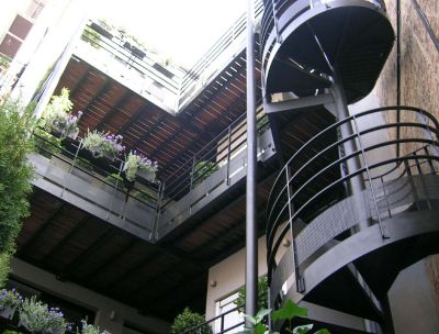 Tekst: <p>Classés Monument national par l’état, les bâtiments de l’ancienne clinique ont été réhabilités en 12 appartements aux étages et en commerces au rez-de-chaussée. L’ancienne cour centrale désormais affectée aux circulations a été couverte d’une verrière. Elle sert d’espace commun sur toute la hauteur de l’immeuble. Les paliers donnant accès aux différents logements associent le métal et le verre. De forme ovale, ils sont détachés des 4 murs de la façade intérieure et incorporent la structure de l’ascenseur sur laquelle ils prennent appui.</p>