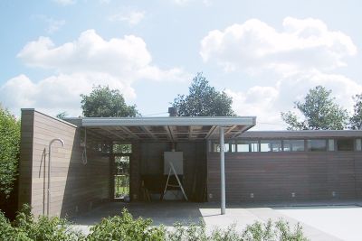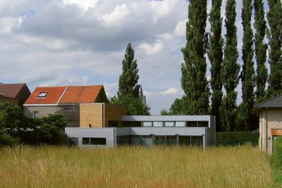 Tekst: <p>L’habitation est constituée de deux volumes imbriqués. La construction en acier a permis de créer des formes nouvelles et au final une belle oeuvre architecturale. Alors que de la rue l’habitation donne une impression de repli sur soi, l’accent est tout au contraire mis sur le côté jardin. La flexibilité des matériaux utilisés, aluminium et acier, a permis de réaliser de nouvelles formes d’habitat. Malgré l’utilisation de ces nouveaux matériaux, les valeurs architecturales élémentaires restent d’application. Ainsi, l’espace n’est pas déterminé par la surface, mais par une mesure dimensionnelle précise, des vides et les principes du duplex. La passerelle non conventionnelle ne réalise pas seulement la liaison entre les chambres, elle est également un lien avec l’espace de vie. La limite de cet espace est réalisée en acier galvanisé. </p>