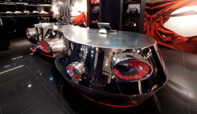 Les parois, isolées acoustiquement, sont revêtues d’une maille en acier inoxydable éclairée par des lampes ‘Led’ aux couleurs variées.</p>