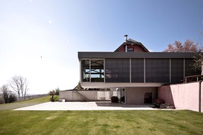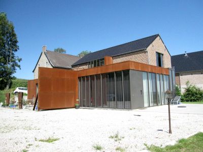 Tekst: <p>Une ancienne ferme située au cœur du Pays de Herve a été entièrement rénovée. Elle accueille, trois appartements et une piscine couverte. Une nouvelle construction se greffe au bâtiment principal existant. Elle est revêtue d’acier autopatinable. Le bardage est en parfaite harmonie avec le cadre dans lequel il s’insère, la teinte rouille s’affichant largement à travers nos paysages tout au long des saisons. L’ensemble est homogène, mais chaque élément porte bien la marque de son époque. L’acier autopatinable a été mis en œuvre aussi simplement que possible : il n’y a pas de débordements, l’ensemble est monolithique, les tôles d’acier sont de grandes dimensions. Le bardage accentue les lignes contemporaines de l’annexe. Il crée un dynamisme géométrique, anguleux et précis. </p>
