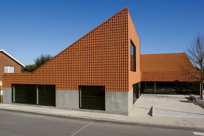 Tekst: <p>Située au cœur du village, l’extension de l’Ecole Communale d’Estaimpuis s’est opérée sous la forme d’une nouvelle construction à implanter à l’arrière du Centre de Lecture Publique d’Estaimpuis. Un parc avec quelques arbres centenaires forme le splendide décor végétal du fond de la parcelle. Les nouvelles salles de cours s’alignent sur le pignon existant, à la limite de la zone constructible pour ouvrir toutes les nouvelles classes vers le parc. Chaque classe bénéficie d’un niveau d’éclairement naturel généreux et d’un accès direct sous le préau. Sa structure métallique constituée très simplement de poutrelles galvanisées assemblées par boulonnage, rythme la façade et offre un espace couvert en dialogue avec le parc.</p>
