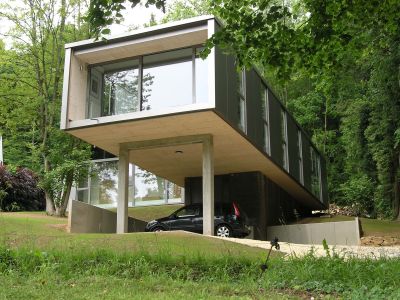 Tekst: <p>Située sur un terrain en pente la maison se pose sur le versant de la colline. ‘Se poser’ avec délicatesse pour l’aile arrière qui est maintenue par deux colonnes à 50 cm du sol et avec hardiesse pour le volume perpendiculaire à la voirie, en porte-à-faux sur le fond de vallée. A son point haut, le volume se plie pour s’accrocher à la pente du terrain. L’articulation se manifeste par la création d’un patio. Le porte-à-faux génère un car-port et défini la zone d’entrée. La construction s’inscrit dans son environnement boisé et ne craint pas d’affirmer son caractère contemporain dans le choix des couleurs.</p>