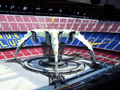 Tekst: <p>Pour une série de 79 concerts à travers le monde, le groupe de rock irlandais U2 a commandé ‘The Claw’ (la Griffe), une structure en acier de 28 m de haut avec une pointe centrale atteignant 51 m. La construction repose sur quatre piliers courbes abritant l’appareillage son et lumière. La structure franchit 60 m sans gêner la vue du public. La structure en acier de 250 tonnes se monte en quatre jours et se démonte en deux jours. Chaque pilier courbe est constitué de 13 segments treillis trapézoïdaux, munis de crochets à souder. Les segments sont constitués de tubes à paroi épaisse formés à chaud. Toutes les découpes des tubes ont été faites à l’aide de machines CNC et soudées à l’aide de gabarits spécifiques. Grâce à une réalisation scrupuleusement identique, les segments sont interchangeables, ce qui simplifie l’installation.