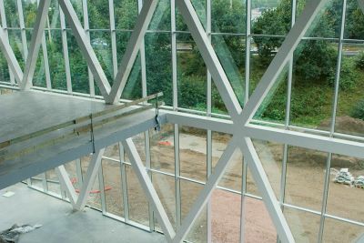 La structure de base en acier est constituée de portiques HEB laqués en poudre et galvanisés à chaud. La finition de la façade permet de distinguer les deux niveaux du volume : les menuiseries extérieures du rez-de-chaussée sont dans le plan des portiques et le verre est clair alors que le niveau +1 est en porte-à-faux et muni de verre de couleur verte.