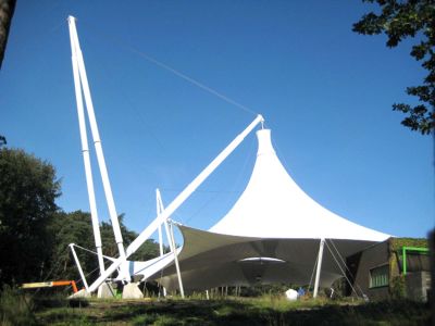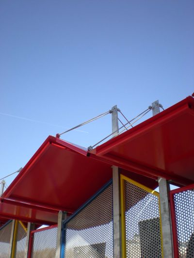 Le souci d’intégration au contexte a plaidé en faveur d’une structure minimale et légère. Quatre poteaux métalliques tubulaires de teinte jaune, rouge, bleu et vert supportent une membrane tendue translucide. Des tirants en inox assurent également la reprise des charges tandis que les blocs dans lesquels ils sont ancrés ont été aménagés en bancs.</p>
