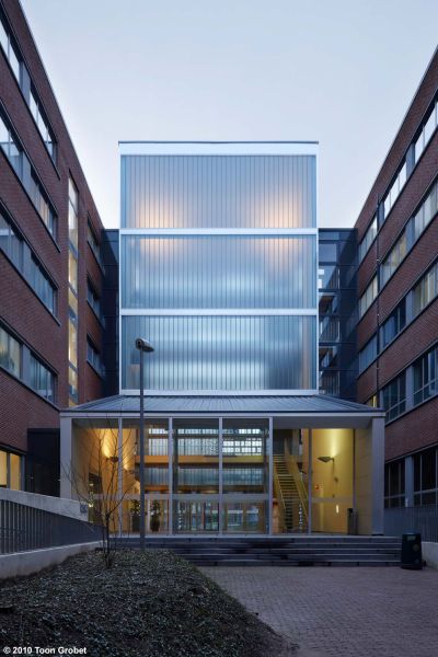 Tekst: <p>Les travaux concernent la construction d’un nouveau bâtiment d’accueil avec salle de conseil et espace de rencontre polyvalent. Ce projet est installé entre deux bâtiments existants de la Faculté des Sciences sociales. Le choix s’est porté sur l’acier, ce qui a permis une construction rapide de la toiture. Ce choix s’est aussi révélé avisé d’un point de vue budgétaire. La structure en pente du toit est constituée de profilés IPE sur lesquels un élément de toiture sandwich a été placé en tant que support pour la couverture à joint debout. La structure de la façade comporte des profilés HEB, HEM, UPN et des profilés creux, tous galvanisés. Le revêtement en tôles d’acier galvanisées a été placé sur un profilé galvanisé en Z. Les boîtes intérieures ont été fixées à la structure. Du carton-plâtre, dont la structure porteuse a été placée entre les profilés, en parachève la partie intérieure. L’exécution de toutes les surfaces en un seul matériau produit un beau contraste avec les briques des façades existantes.