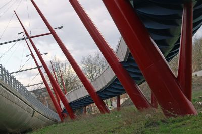 Tekst: <p>Pour franchir la voie rapide à Bruges, le choix s’est porté sur une ‘passerelle paresseuse’, combinaison d’une passerelle et d’un escalier pour vélos. La particularité est l’application décroissante de la formule de l’escalier, c’est-à-dire que les marches ont des dimensions différentes. Le tablier de près de 4 m de large est constitué de tôles d’acier de 10 mm d’épaisseur, rigidifiées par 7 raidisseurs longitudinaux. Deux grandes cloisons longitudinales transforment la partie centrale en caisson. De chaque côté de celle-ci se trouvent des sections dont la face inférieure est oblique et se prolonge dans le bord rond de la passerelle. La passerelle est constituée de quatre travées et peut se déformer librement dans le sens de la longueur, de manière à éviter tout effet de ressort. Des renforts intérieurs ont été appliqués aux endroits où les piles supportent le tablier. Dès la conception, il était évident que cette structure élégante ne pouvait être construite qu’en acier. </p>