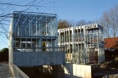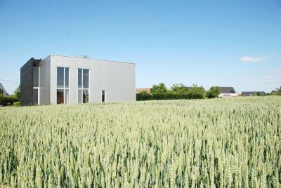 Tekst: <p>Cette habitation unifamiliale à Merelbeke a été réalisée avec une structure en acier invisible de l’extérieur. Des panneaux lisses blancs en béton et des panneaux sandwich métalliques sombres ont été montés sur cette structure. Les panneaux métalliques préfabriqués Kingspan ont une isolation de 10 cm PUR et sont revêtus tant à l’intérieur qu’à l’extérieur d’un platelage métallique plat. Leurs côtés extérieurs ont été alignés avec les panneaux de façade préfabriqués et isolés en béton. Une structure en acier secondaire a été réalisée à cette fin avec des profilés en L. Les poutres primaires de la structure en acier sont également en forme de L de manière à ce que le plafond se prolonge autant que possible de manière continue. Elles sont dissimulées dans l’épaisseur du plancher. Les murs intérieurs sont tous non porteurs et ont été répartis selon le rythme des poutres et colonnes de la structure en acier.</p>