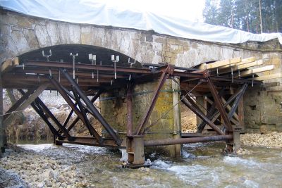 dans la stabilisation de l’ensemble, car suite aux dégradations causées par les multiples inondations et l’absence de maintenance pendant des décades, la pile centrale et les culées en pierre naturelles risquaient de s’écrouler. <br>