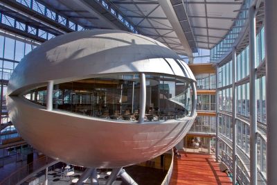 Les façades en polycarbonate à 4 chambres lui confèrent homogénéité et transparence tandis qu’une corniche périphérique en acier flotte comme une aile au-dessus du bâtiment. Cette corniche de 2 mètres de large souligne tout en finesse et en légèreté la forme organique du bâtiment. Elle est constituée d’une structure portante en acier revêtue de panneaux thermolaqués.</p>