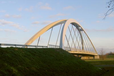 Tekst: <p>Grâce et élégance, deux points de départ importants pour cette passerelle cyclable de 170 m. C’est pourquoi la passerelle a été réalisée en acier, des poteaux aux supports du tablier, des montants du garde-corps aux balustrades en acier inoxydable.<br>