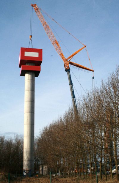 Tekst: <p>À Jabbeke, la Régie des Bâtiments a fait ériger une tour radar météorologique destinée à l’IRM. Le projet comprend la construction d’une tour d’accès haute de 45 m, surmontée d’une structure en acier devant abriter l’appareillage pour les mesures météorologiques. La construction est constituée d’un noyau surmonté d’une construction en acier de 50 tonnes. Un escalier à vis a été érigé en quatre parties qui, l’une après l’autre, ont été fixées avec la plus grande précision au corps en béton. La construction de la partie sommitale est une boîte carrée sous laquelle est attachée une plateforme d’accès. La hauteur et la forme de la tour ont amené les concepteurs à tenir compte dans une grande mesure de l’influence des vents et de l’effet tourbillonnant.</p>