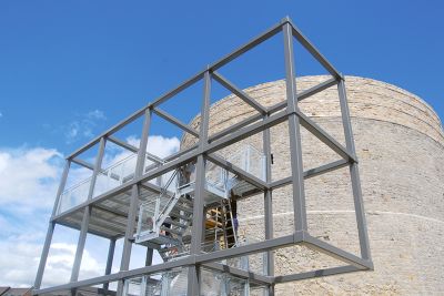 Tekst: <p>Une forme, une masse ..une tour, un donjon!.. ce projet se devait de conserver la force du concept initial et ne souffrir d’aucun artifice architectonique, ni d’empilement démonstratif technique. C’est la raison pour laquelle l’architecte a opté pour une utilisation radicale d’acier autopatinable. Ce sujet était l’occasion d’expérimenter une autre conception de l’acte de construire : une coque étanche en acier auto-patinable structurant, fabriquée en atelier pour se substituer à la toiture de la chapelle. Le cube d’environ 6 m d’arrête vient ainsi doubler le volume existant en hauteur dégageant trois niveaux. Laminé à chaud, l’acier noir se transforme lentement chaque jour, prenant sa teinte rouille en accord avec la pierre meulière dont est constitué le socle. Ce bloc est-il plein ou vide? L’architecture ne laisse rien transparaître de sa technicité, de son programme, en fuyant tout maniérisme ... et cela grâce à l’acier !