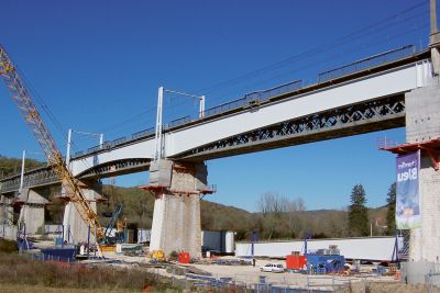 L’utilisation d’un ‘bac à gravier’ permet aux rails de passer en courbe sur le pont droit.</p>