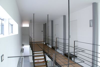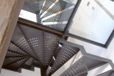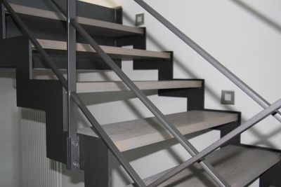 Tekst: <p>Pour l’extension de cette maison individuelle, de nouveaux escaliers ont été dessinés afin de permettre l’accès du rez au premier et au deuxième étage où une passerelle métallique relie l’extension au bâtiment existant. L’escalier est construit avec limons latéraux et supports pour marches en bois. La structure ainsi que le garde-corps sont réalisés en acier laqué, les sols des paliers et de la passerelle (ainsi que son garde-corps) sont en verre. L’acier a été choisi car il permet une construction solide d’épaisseur minimale.</p>
