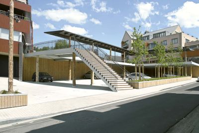 Tekst: <p>Ce projet de 4 unités de logements réparties en 2 immeubles bi-familiaux combine les avantages de l’immeuble à appartements et de la maison mitoyenne de manière à offrir aux occupants un maximum d’espace et d’intimité dans un volume compact. Celui-ci est agrémenté de grandes terrasses reposant sur une structure métallique en acier galvanisé à chaud. Les profilés verticaux, dans l’alignement des mitoyens, supportent les cadres de terrasses. Dans ces cadres sont placées des prédalles formant le coffrage perdu de la dalle de la terrasse. Le choix de l’acier pour la structure s’est imposé pour sa facilité de mise en oeuvre et sa légèreté, en opposition au volume compact de l’édifice et afin de ne pas entraver l’apport de lumière dans le bâtiment.</p>