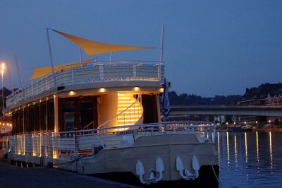 Tekst: <p>L’ancienne péniche est transformée en ‘bateau événementiel’ utilisé sur 2 niveaux, à savoir : l’espace cale et le pont supérieur couvert par une structure légère permettant de fermer l’espace sur environ 2/3 de la péniche. Du point de vue technique, la coque est isolée avec 8 cm de mousse polyuréthane projetée à même la tôle. Le lest quant lui est réalisé grâce à un béton coulé sur place à fond de calle et lissé. La structure devait pouvoir accueillir 300 personnes et couvrir un espace de réception intérieur mais largement ouvert sur le paysage, le tout le plus harmonieusement possible par rapport à la ligne du bateau. On trouve donc une alternance de lignes horizontales entre une partie de la coque enfoncée, des garde corps blancs, une série de vitrage et la rive de la couverture épaisse.
