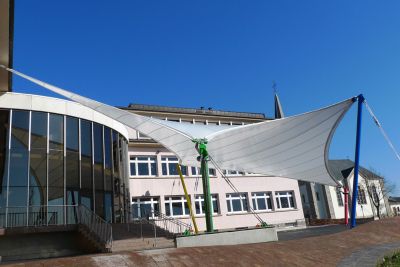 Tekst: <p>Pour ce projet qui comprend une école primaire, une école précoce, une structure d’accueil ainsi qu’un hall des sports, un ensemble d’auvents en acier a été réalisé dans la cour ainsi qu’au dessus de la rampe d’accès à l’école primaire. Ces structures légères et aérées combinent un système de poteaux de section ronde reliés par des traverses de section carrée et une ossature secondaire faite de tubes de section carrée supportant le bac de couverture. Une note de fantaisie est introduite par la disposition aléatoire des poteaux qui se prêtent parfaitement aux jeux d’enfants.</p>