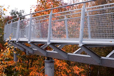 La passerelle est supportée par un profilé creux de 350 x 480 mm en forme de tire-bouchon. Ce caisson est aussi incliné d’un côté pour assurer l’évacuation de l’eau. Il est soutenu par des colonnes en acier faites de tubes ronds d’un diamètre de 508/16. Le tablier est supporté par un réseau de profils IPE 140 et de poutrelles assemblées en cône d’une hauteur allant de 480 mm à 240 mm. Le garde-corps est constitué de tôles de 10 et 15 mm. Enfin, sur ces montants sont fixés des cadres en inox avec un filet en inox.</p>